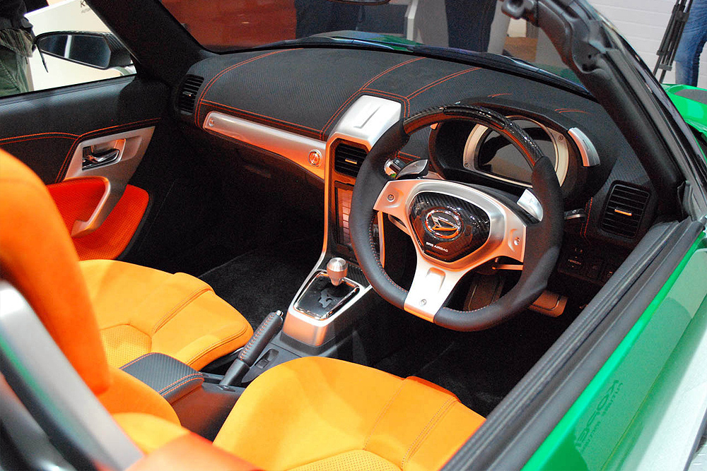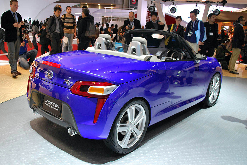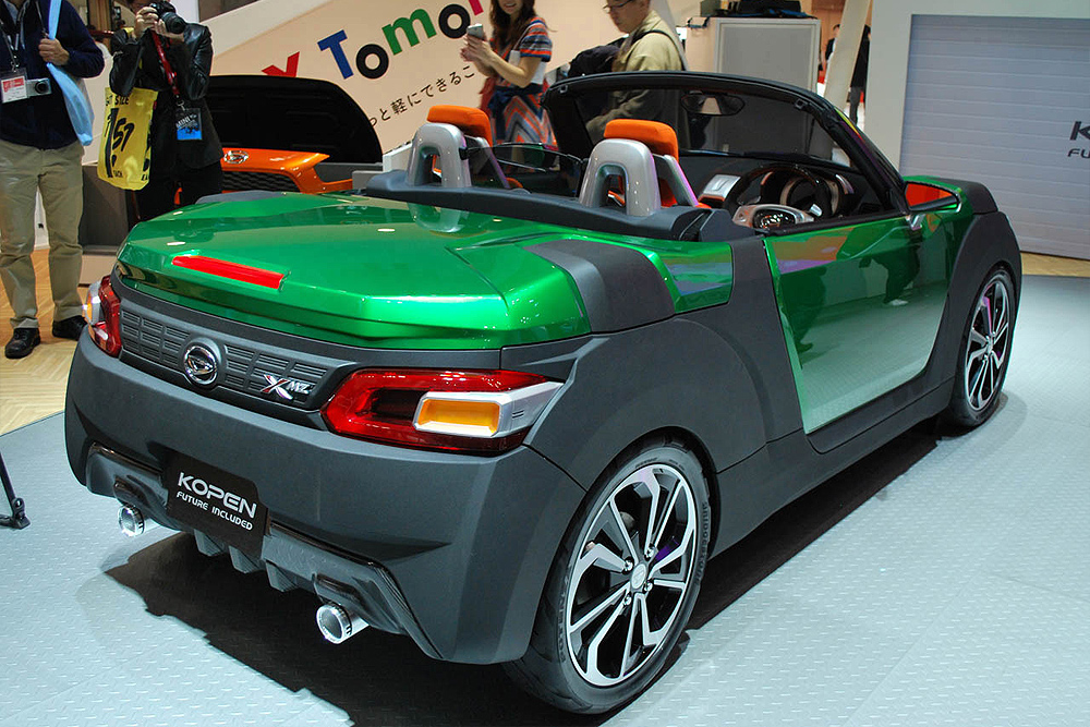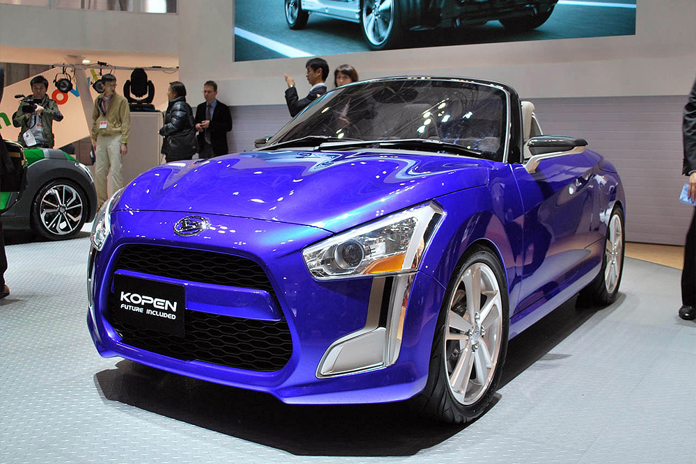 Если Toyota Aqua Air похожа на машину Барби, то Daihatsu Kopen напоминает мультяшный Nissan GT-R. При этом по габаритам автомобили близки: Kopen имеет длину 3395 мм, ширину 1475 мм и высоту 1275 миллиметров. Один из представленных прототипов по кругу защищен пластиковыми накладками, а второй, в синем цвете, выглядит более изящно. Съемная крыша выполнена из пластика.