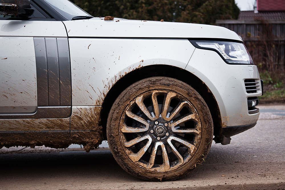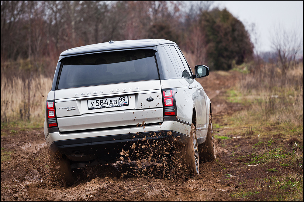 Нам удалось протестировать Terrain Response только в режимах авто и грязь/колея. Поведение автомобиля впечатляет. Когда протектор окончательно забивается грязью, машину периодически начинает сбрасывать с траектории движения, происходит небольшой снос задней оси. При этом даже в размокшей жиже внедорожник чуть пробуксовывает, но уверенно едет дальше. Даже если совершить ошибку – сбросить газ и остановиться в самом центре размокшей, грязной борозды, Range Rover без проблем стартует с места.