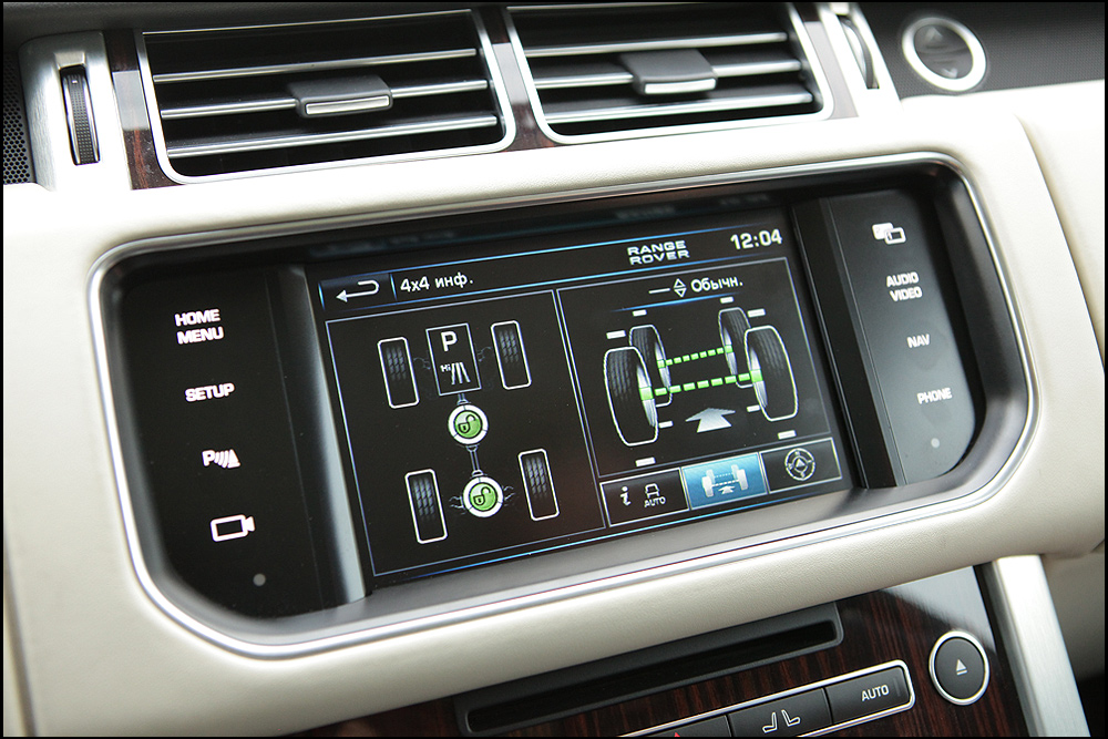 Обновленная Terrain Response имеет несколько режимов работы: автоматический, трава/гравий/снег, песок, грязь/колея, камни-малый ход. В зависимости от выбранной иконки Range Rover использует разные настройки работы противобуксовочной системы, меняет клиренс и управляет блокировкой дифференциалов. Если не уверены в том, какой режим лучше подойдет для конкретных дорожных условий, смело ставьте селектор в положение Auto: 500 раз в секунду система собирает информацию о дороге и анализирует ее на основе данных о скорости, вибронагруженности, артикуляции мостов и кренах, а после выбирает нужную величину дорожного просвета и режим работы вспомогательных систем и дифференциалов.