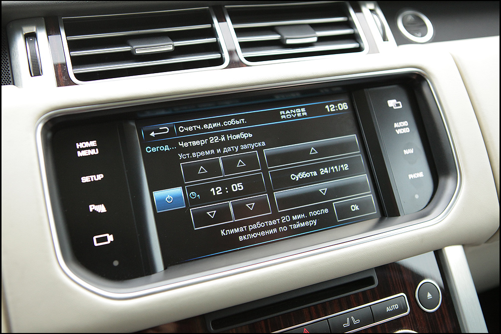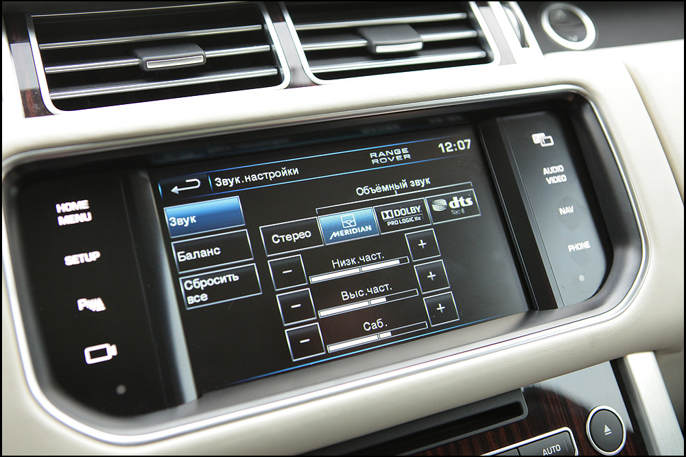 Часы, проходящие за изучением всех возможностей автомобиля, пролетают, как минуты. Это как с новым телефоном или планшетником: стоит купить, и на какое-то время других интересов у тебя нет. Сначала пробуем все варианты подсветки. Их 10: от ярко-красного до фиолетового. Покопавшись в меню, находим систему дистанционного запуска двигателя. Можно выставить на определенный день или установить запуск в одно и то же время ежедневно. Через пару пунктов – управление стереосистемой. Опционально устанавливаемая на автомобиль система Meridian – просто сказка. Звук даже чище и лучше, чем у Bang&Olufsen на Aston Martin Rapide, которая до встречи с новым Range Rover казалась эталоном в автомобильной акустике. 29 динамиков и сабвуфер, общая мощность – 1,7 кВт (к слову, на недавней свадьбе товарища на помещение площадью около 150 кв. м. хватило 1 кВт): великолепно звучит любая музыка от классики до хип-хопа.