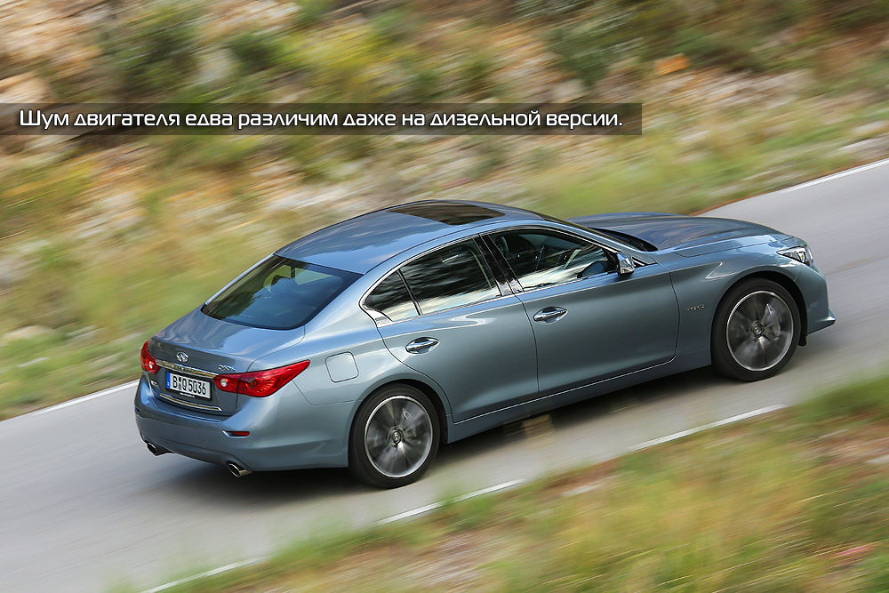 Помимо гибрида, мне также удалось попробовать дизельную версию. Несмотря на то, что пока поставки этой модификации в Россию не планируются, такой Q50 все же представляет немалый интерес. Прежде всего, это первый Infiniti c двигателем Mercedes-Benz. А еще дизельные машины были оснащены обычным механическим рулевым управлением.