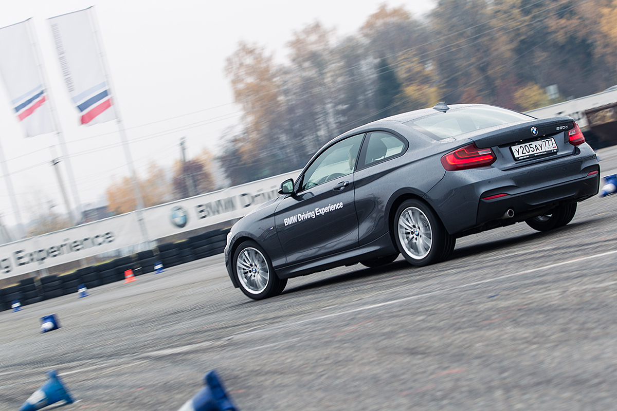 Упражнения предложили выполнить на гражданских версиях BMW – дизельных «двойках» (220d) и бензиновых «тройках» (328i). Причем, на всех без исключения машинах была установлена автоматическая трансмиссия – не лучшее решение для дрифта. Но сначала – теория. В какой-то момент часовое занятие в аудитории начинает перерастать в курс школьной физики: инструкторы рассказывают о центробежной силе, силе трения и распределении массы по осям во время выполнения различных маневров. Без всего этого невозможно понять, как бороться со сносами и заносами в реальных условиях.