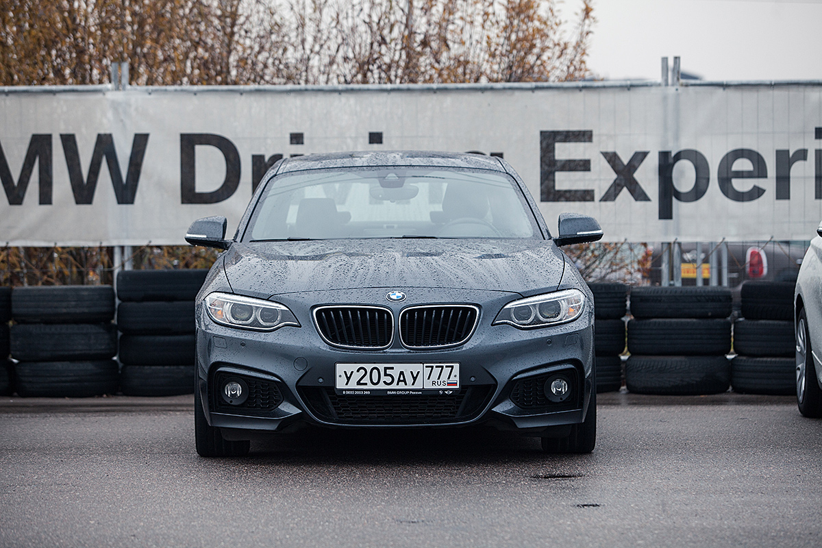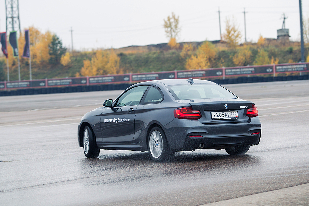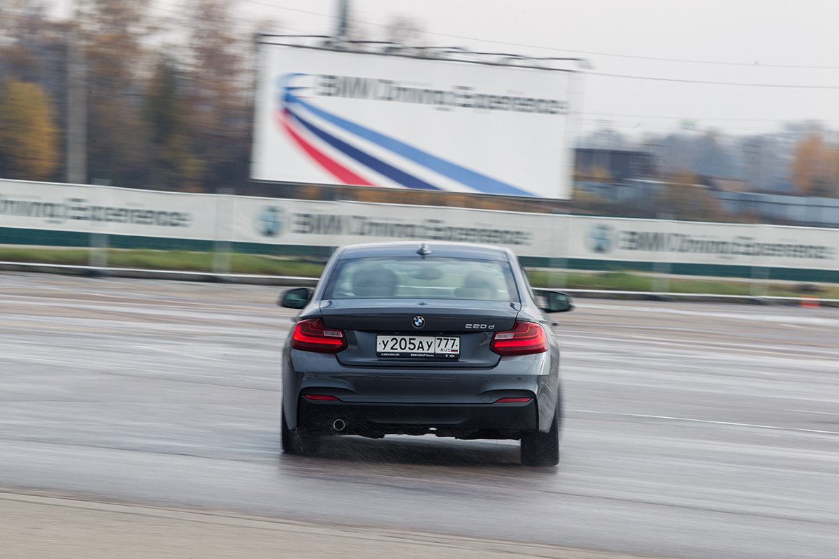 На мокром асфальте с выключенной системой стабилизации BMW 220d при каждом маневре норовит развернуться на 180 градусов. Во время выполнения упражнений пришлось какое-то время привыкать к педали газа: вроде бы четко понимаешь, что нужно делать, но из-за полусекундных задержек на нажатия автомобиль либо преждевременно стабилизируется, либо отправляется в неуправляемый вальс. Уже через полчаса пришлось включить кондиционер и снять жилетку: стало невыносимо жарко.