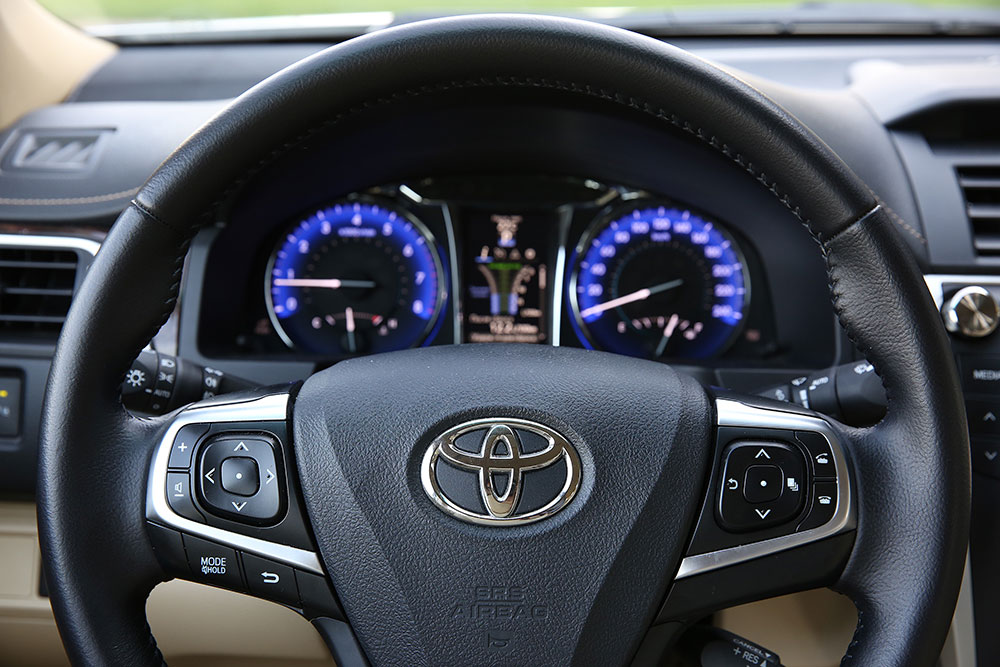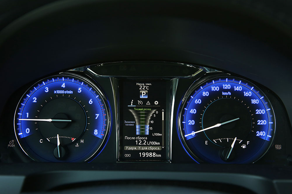 А вот панель приборов у Camry вполне современная. Цветной экран, четкие шкалы, показания которых отлично считываются. К слову, у Camry, i40 и Mondeo экран на приборке расположен между тахометром и спидометром, а у Mazda6 - справа от них. Выглядит более оригинально, но, как оказалось, это не всегда удобно.