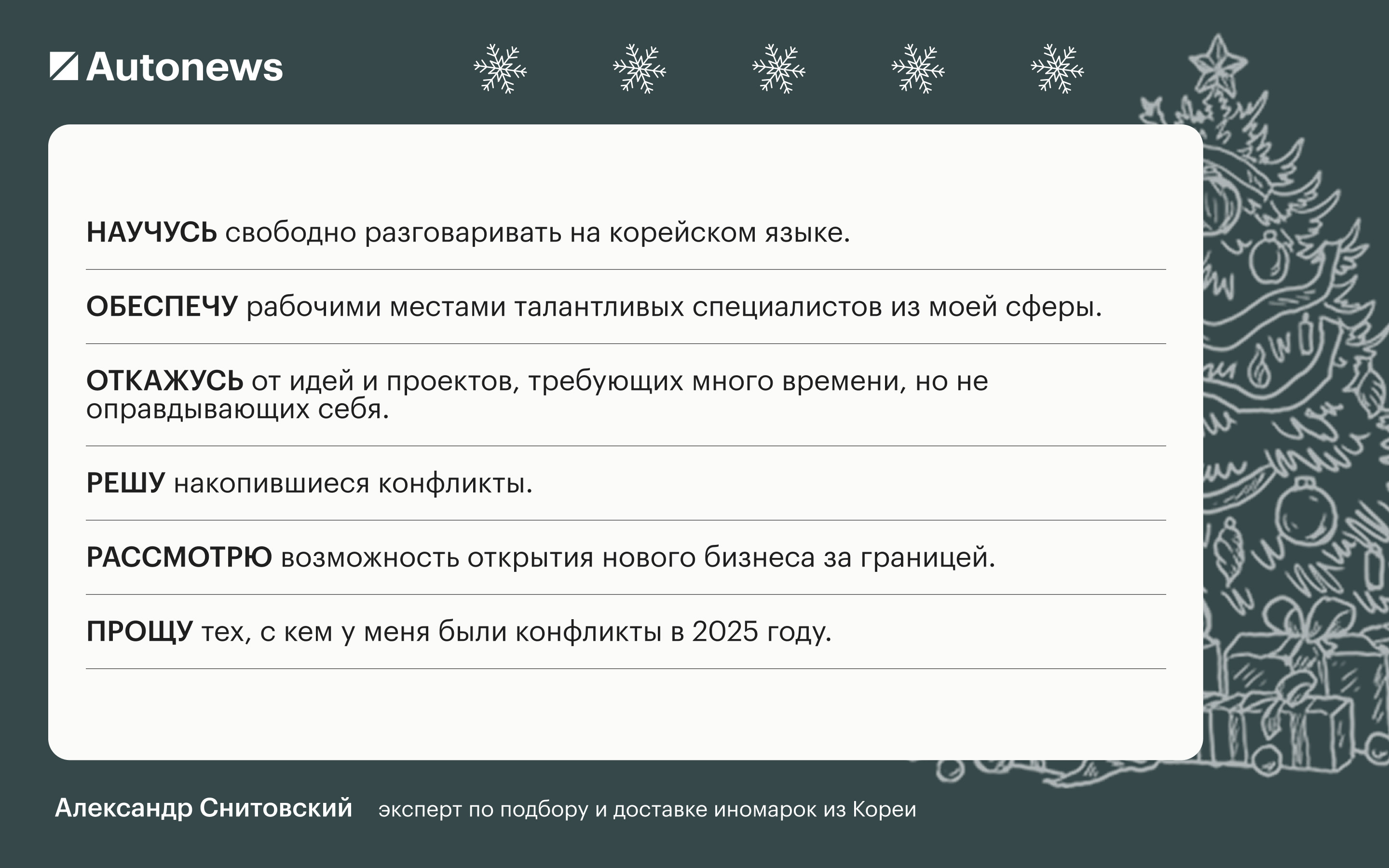 В проекте «П(р)оверим на слово» мы попросили постоянных героев РБК Авто — автоэкспертов, топ-менеджеров, импортеров, дилеров и прочих игроков рынка — публично поделиться личными обещаниями и планами на 2026 год. Спикерам предлагалось дополнить фразу «в 2026 году я обязательно...» и 12 глаголов (создам, инвестирую, научусь и другие) с возможностью добавить собственный вариант.